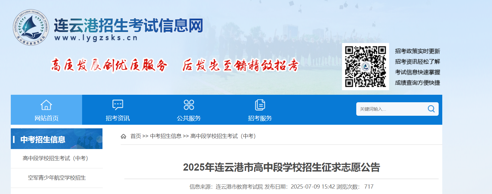 2025年江苏连云港市高中段学校招生征求志愿公告(填报时间7月10日-11日)