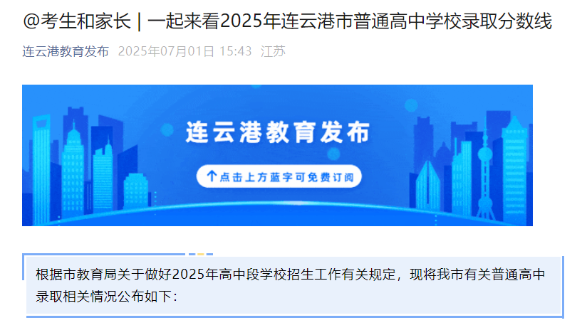 2025年江苏连云港中考普通高中学校录取分数线公布