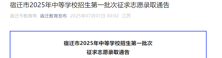 2025年江苏宿迁中等学校招生第一批次征求志愿录取通告
