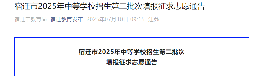2025年江苏宿迁中等学校招生第二批次填报征求志愿通告