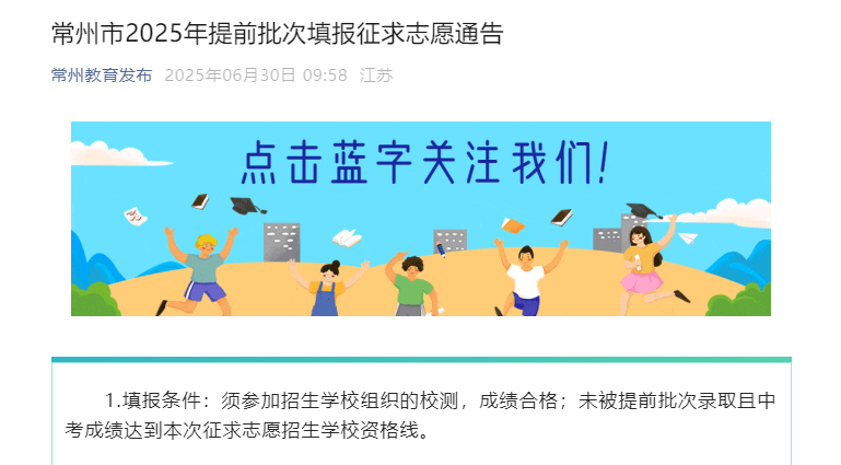 2025年江苏常州中考提前批次填报征求志愿通告(6月30日12:00-18:00填报)
