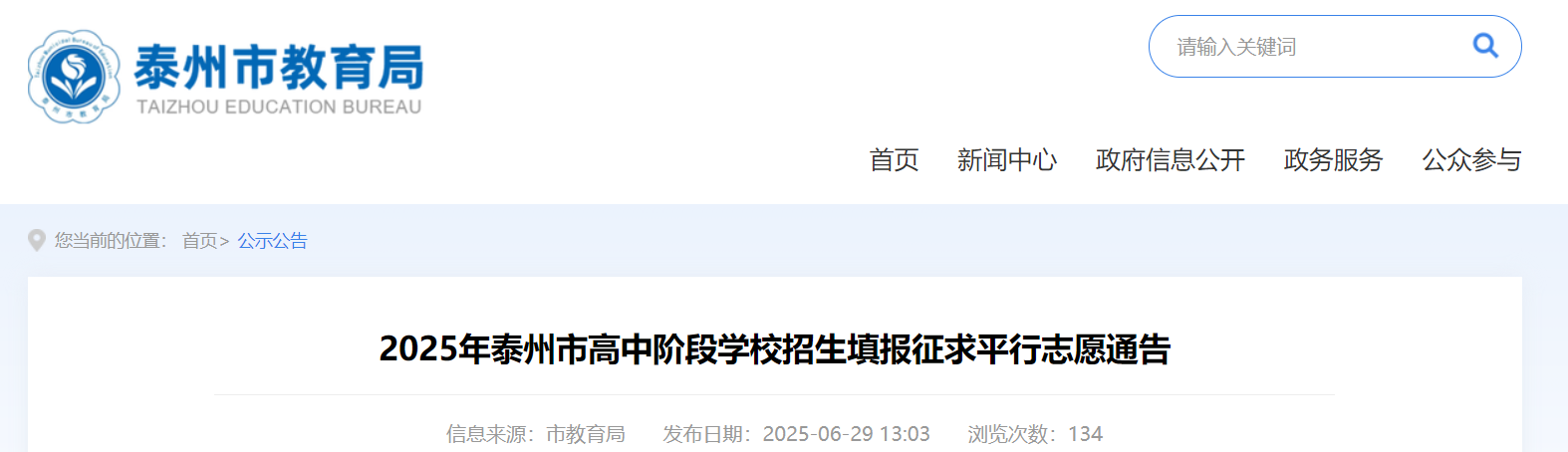 2025年江苏泰州市高中阶段学校招生填报征求平行志愿通告(7月1日9:00起)