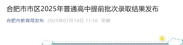 安徽合肥市市区2025年普通高中提前批次录取结果公布