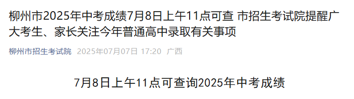 柳州中考招生网查分:2025年广西柳州中考成绩查询入口已开通