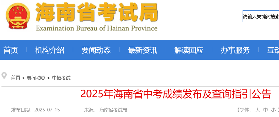 海南省考试局:2025年海南省中考成绩发布及查询指引公告