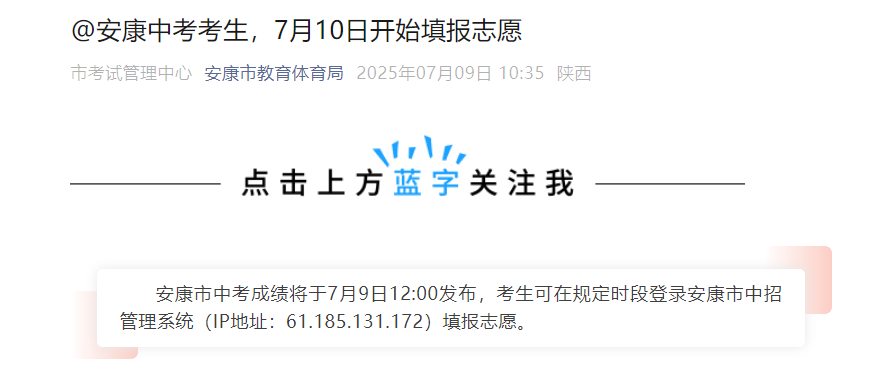 2025年陕西安康中考志愿填报时间及入口(7月10日8:00起)