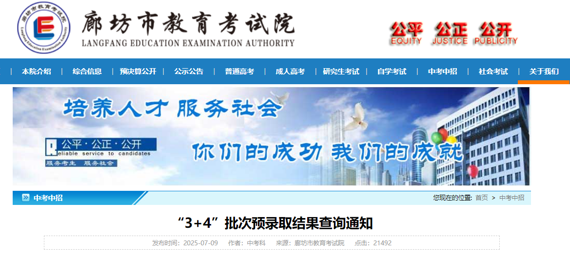 2025年河北廊坊中考“3+4”批次预录取结果查询通知