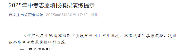 2025年河北石家庄中考志愿填报模拟演练提示:模拟填报6月30日-7月2日