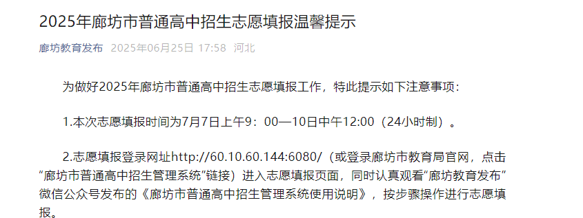 2025年河北廊坊中考志愿填报时间及入口(7月7日9:00-10日12:00)