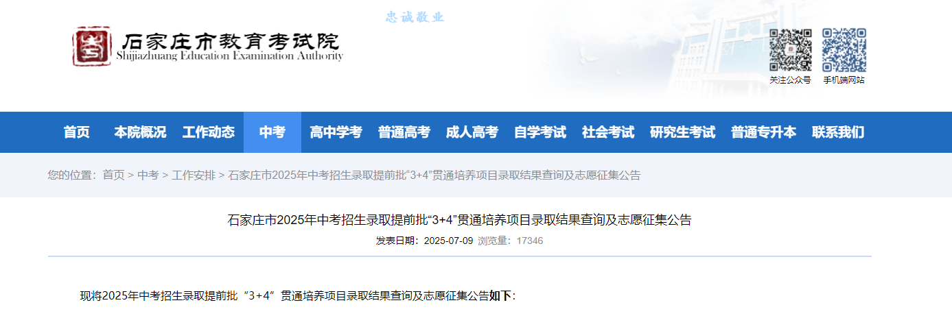 2025年河北石家庄中考招生录取提前批“3+4”贯通培养项目录取结果查询及志愿征集公告