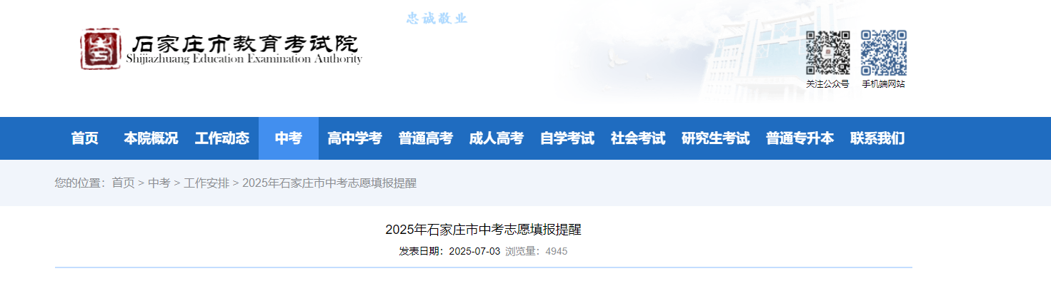 2025年河北石家庄中考志愿填报时间及入口(7月4日9:00至7月7日 9:00)