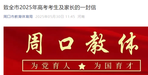 致河南周口市2025年高考考生及家长的一封信公布 高考时间为6月7至9日