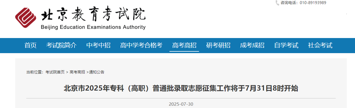2025年北京专科高职普通批录取志愿征集工作将于7月31日8时开始 录取8月1日进行