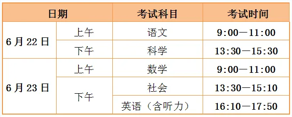 2.文化科目考试时间:6月22、23日,详细时间安排见下表。