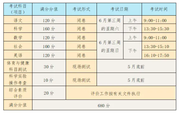 语文、数学、英语、科学、社会等5门科目实行省级统一命题,总分值620分。“英语”总分值120分,其中笔试100分、听力20分。文化科目考试均实行闭卷考试。