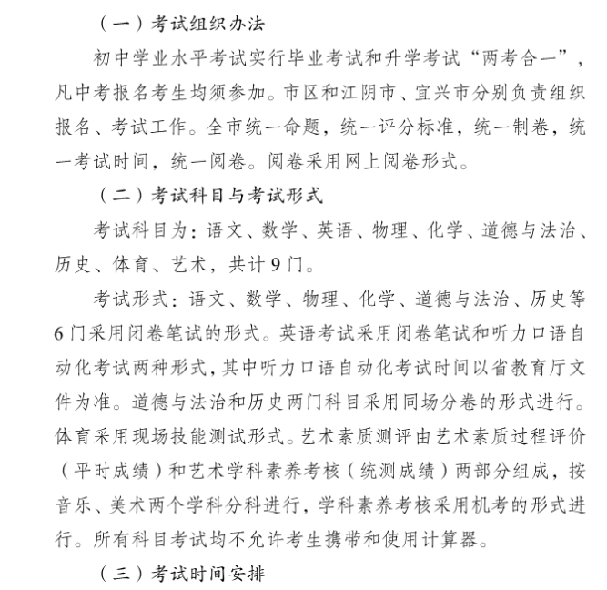 语文、数学、英语(书面考试)、物理、化学、历史实行闭卷考试,道德与法治实行开卷考试,英语听力口语自动化考试按省教育厅有关文件执行,体育考试方案另发。考试用时语文为150分钟,数学为120分钟,英语(书面考试)、物理、化学均为100分钟,道德与法治、历史均为50分钟。