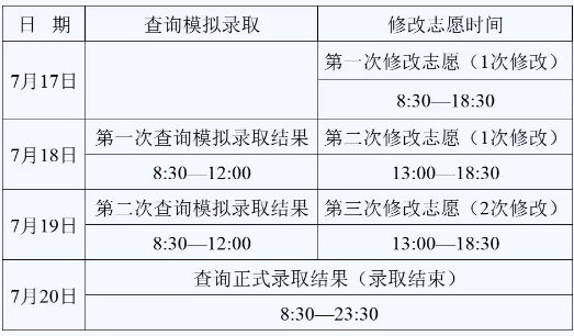 1.第一阶段:预填报志愿6月17日—18日6:00—23:00。所有考生必须参加第一阶段预填报志愿,考生首次填报志愿信息表须一次完成所有批次志愿填报;在第二阶段未修改志愿的考生以预填报志愿作为最终正式志愿。