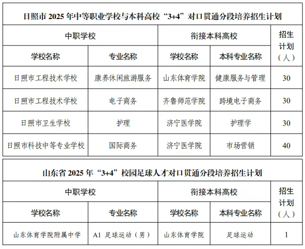 2.本批次可填报”3+4"对口贯通分段培养职业学校(以下简称”3+4'职业学校”)计划和”3+4"校园足球人才对口贯通分段培养招生(以下简称"3+4'足球")计划志愿。其中报考"3+4"足球计划的考生须符合《山东省教育厅关于下达 2025 年山东省体校与体育院校"3+4"校园足球人才对口贯通分段培养试点工作任务的通知》(鲁教体函〔2025〕17号)要求,并且通过专业测试。